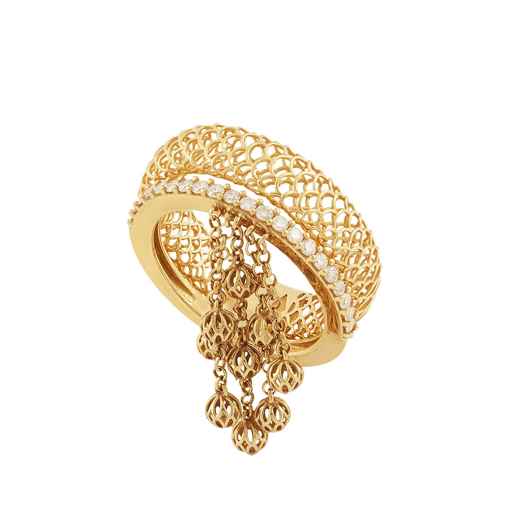 Anel filigrana com penduricalhos, com aproximadamente 7 gramas de ouro.
